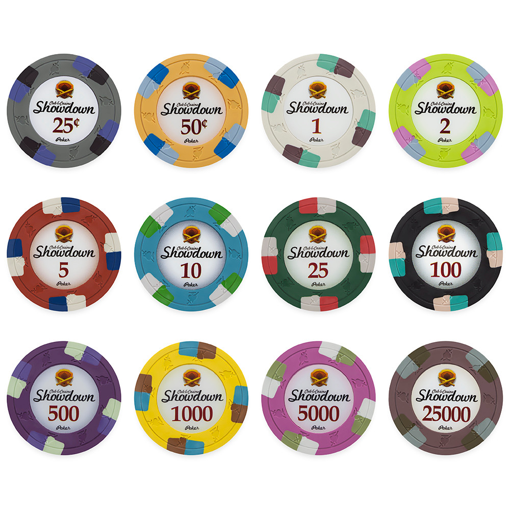 Your source for casino-grade poker chips with a nod to the Vegas of yesteryear, Claysmith Gaming has added three new chips to its roster. Say hello to our 3-color mold Showdown poker chips. Each Showdown Club chip is pressed with a handsome Sword & Spade mold and features Two-tone Block edge spots with a clean and regal inlay. Available in 12 colorful denominations from $0.25 all the way up to $25,000, these classic chips are great for cash games and tournaments alike. Made with the same quality clay composite as other Claysmith chips like The Mint and Bluff Canyon, each Showdown chip weighs a heavy and substantial 13.5 grams and feels great to shuffle and stack. These chips are available in 12 different denominations: $0.25 cents, $0.50 cents, $1, $2, $5, $10, $25, $100, $500, $1000, $5000, & $25,000. NOTE: YOU WILL RECEIVE A ROLL OF 25 NEW CHIPS PER ORDER. SUBJECT TO AVAILABILITY.