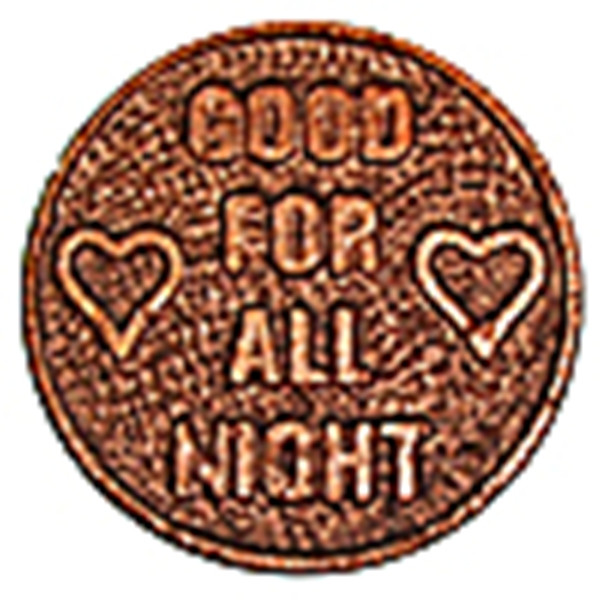 A reproduction period chit promising a night of escape. Raised lettering and solid brass with an "antiqued" finish. 2 sided. 1-1/2 inches in diameter. Authentic reproduction. VERY LIMITED QUANTITIES! I also have over 50 other card cover/card guard designs available in my store.
