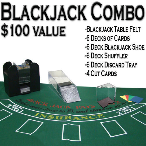 This all-in-one blackjack combination pack provides you with everything you need to host your own blackjack party. This pack includes a blackjack felt, 6 decks of playing cards(brand of cards subject to change), a 6 deck blackjack shoe, a 6 deck discard tray, 4 cut cards and a 6 deck shuffler. This new portable felt has a layout for the popular casino game, Blackjack. Blackjack is a game played in Casinos around the world. Now bring the excitement of casino gaming to your home. The Layout is 36" by 72" and can be easily used on a home table for parties. The layout travels well and is water resistant. Great for a gift. This Casino Grade Black Jack Shoe is a must for any Black Jack player. This heavy duty acrylic Black Jack shoe is perfect for dealing Black Jack. The Wedge is heavy weighted to ensure the appropriate amount of pressure is placed on the cards to ensure they stay flush with the surface of the dealing slot. This shoe holds 6 decks easily. The cards slide out of the front dealing slot efficiently to ensure a professional like dealing experience. The Casino Grade Discard is also heavy Duty Acrylic. This Tray holds 6 decks easily. The cards are held in place by the 2 walls and stack until your dealing shoe is empty. This 6 Deck Automatic Card Shuffler is battery operated. It shuffles standard or bridge sized playing cards. This uses 4 "C" Sized batteries, not included. Over a $125 retail value. This is a great buy and you are getting great quality, brand new equipment. Great for home casino nights or parties.